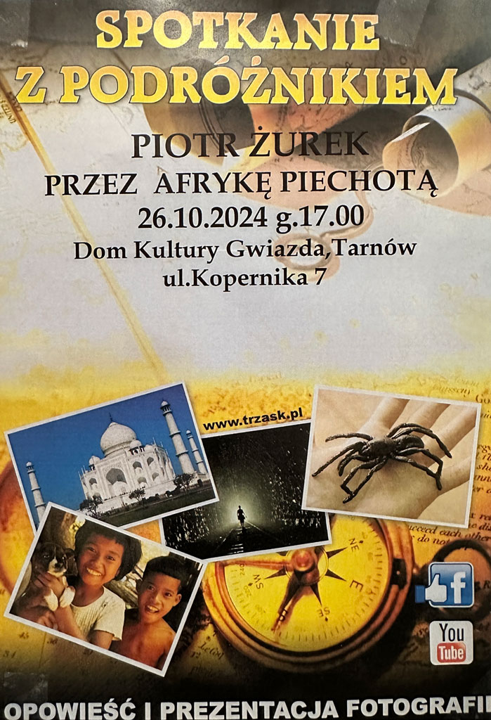 Piotr Żurek – niezwykła osobowość w świecie podróżników, odwiedził kilkadziesiąt krajów świata, jego ulubionym kontynentem jest Afryka. Często, co wydaje się nieprawdopodobne, podróżuje bez planu, na zasadzie wezmę co los przyniesie. Na spotkaniu w jesienny wieczór nie zabraknie barwnych opowieści i przepięknych slajdów, a że z zawodu jest fotografem, przeniesie nas wprost do kolorowej i dzikiej Afryki. Bilety do nabycia na: KupBilecik.pl